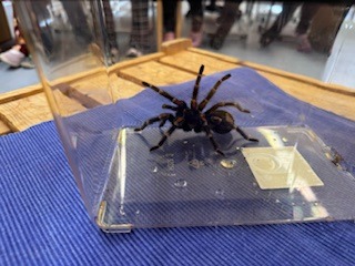Innerhalb der Unterrichtsreihe „Haustiere“ erhielten wir nicht nur Besuch von einem Hund, sondern auch von einer Vogelspinne. Das für uns als Haustier doch recht ungewöhnliche Tier erschreckte und faszinierte uns gleichermaßen. Mit seinen Haaren wirkte die Spinne fast schon kuschelig. Doch natürlich ist sie hierfür gar nicht geeignet. Zwar würde die Spinne sich auf die Hand nehmen lassen aber bei uns im Klassenraum war sie dafür zu nervös. Das konnten wir deutlich am Abwurf der Haare am Hinterleib erkennen. Diese Haare bewirken bei Berührung einen brennenden Juckreiz. Gefährlich ist diese Vogelspinne für den Menschen allerdings nicht, es sei denn man leidet an einer allergischen Reaktion auf Bienen- und Wespenstichen. Denn das Gift dieser Tiere ist dem der Vogelspinne ähnlich. Wir erfuhren viel über die Lebensgewohnheiten dieser großen Spinnen, zum Beispiel, dass sie sich viermal häuten bevor sie ausgewachsen sind, dass sie sich unter anderem von Heuschrecken ernähren und dass sie viele Monate ohne Futter überleben können.